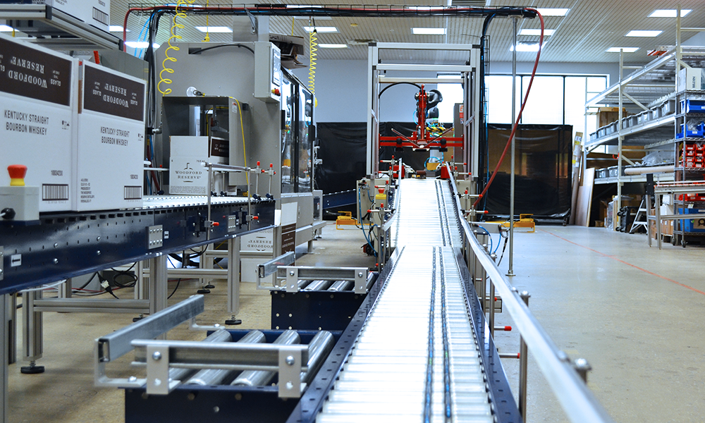 Using a PalletizHD as the palletizing robot, the ONExia Robotics engineers sourced the additional stationary packaging equipment and designed a custom conveyor configuration that worked within the footprint available for the project.