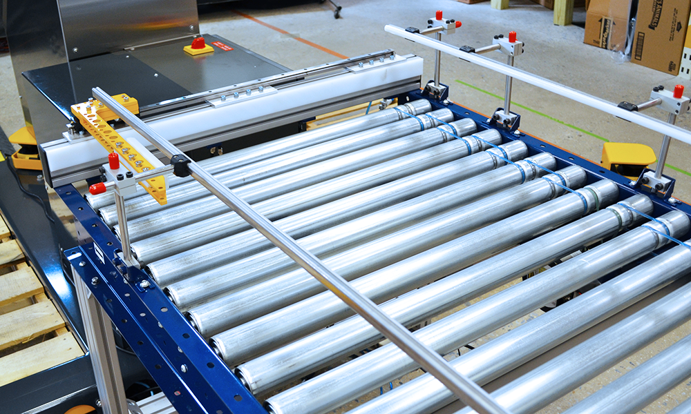 In line with the new manual packing stations, a powered conveyor line automatically moves heavy cases downstream eliminating ergonomically unsafe movements.